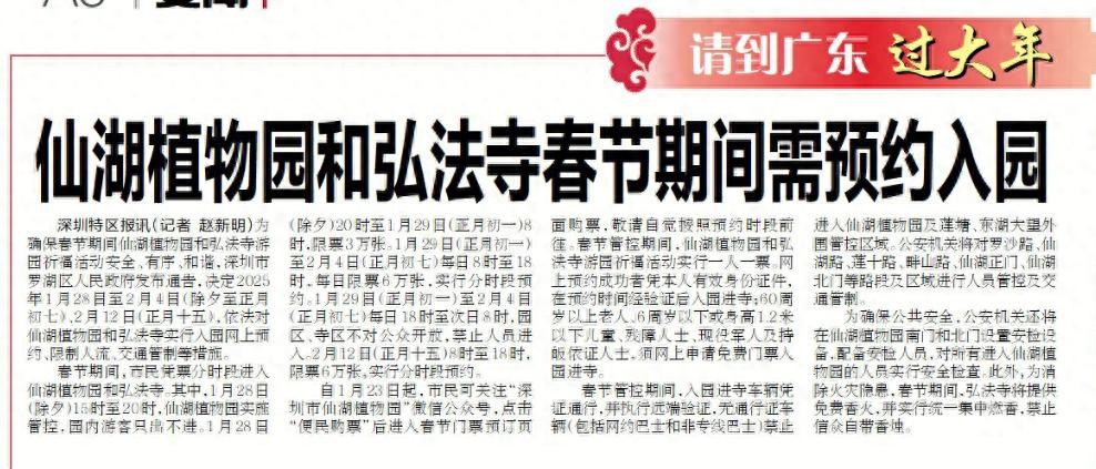 【深圳特区报】仙湖植物园和弘法寺春节期间需预约入园
