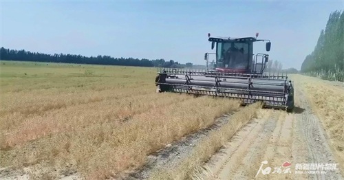 2023年6月12日,大型收割机在阿拉尔市新疆塔禾农业科技有限公司万亩孜然种植基地采收孜然。陈学亮摄