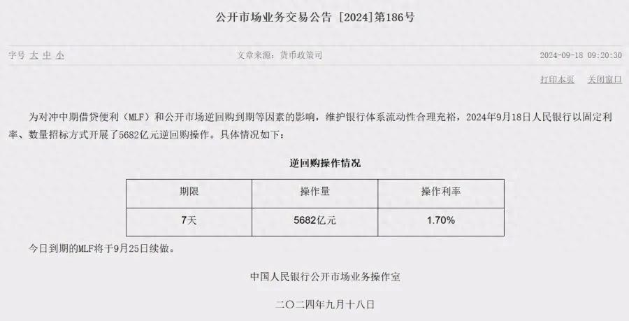 北京,2024年9月20日,今日中国人民银行(央行)宣布了一系列重要的货币操作,包括总额达5682亿元人民币的逆回购和即将进行的中期借贷便利(MLF)续做。这一系列措施旨在维持银行体系内合理的流动性水平,并为经济提供必要的支持。