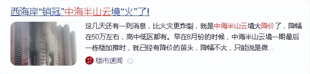 另外,中海半山云镜去年卖得不错,但这个盘体量很大,房源多,去化有压力,它的一期其实一直有房子,而且都是好楼层,价格也越卖越底,目前均价只能维持在18000元一平。“买半山云境的,基本都是冲着学区房去的,这在当下其实是最大的风险。本人之前曾经多次嘱咐过,现阶段买高价盘一定要谨慎,因为你无法识别他们到底有没有降到位,这些房子稍微动一动,几十万就打水漂了,事实证明果真如此,这些盘降起价来壕无人性,亏上个三五十万都是小钱。”