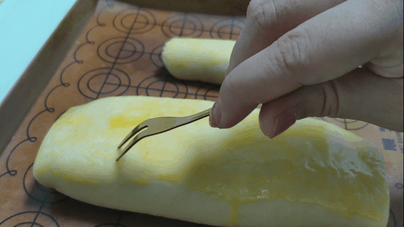 8.将面胚放入烤盘中,表面刷一层蛋黄液,用叉子划出纹路。