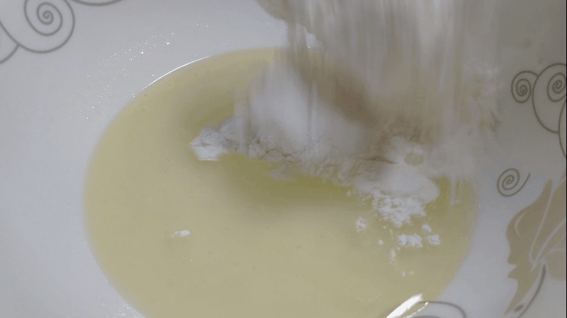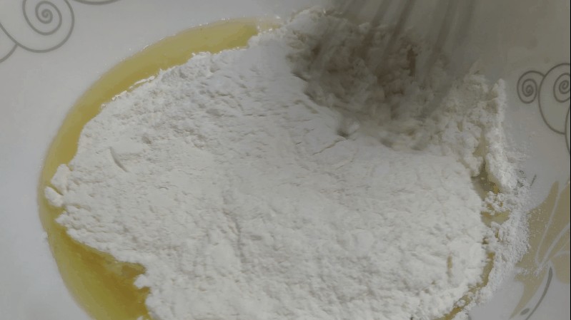 2.放入小苏打和面粉,搅拌成絮状。
