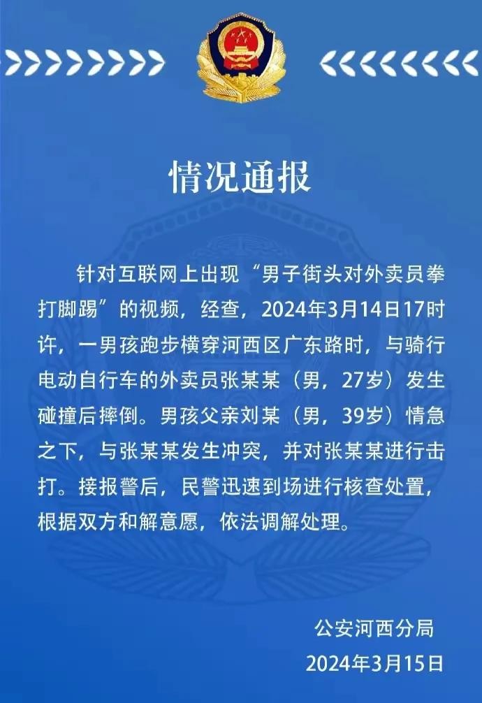 当天晚上,天津市公安局河西分局发布了情况通报,这个通报引起了网友们的巨大质疑:把外卖员张某的单方面被打,说成两人之间发生冲突,而且打人者还是在“情急之下”。