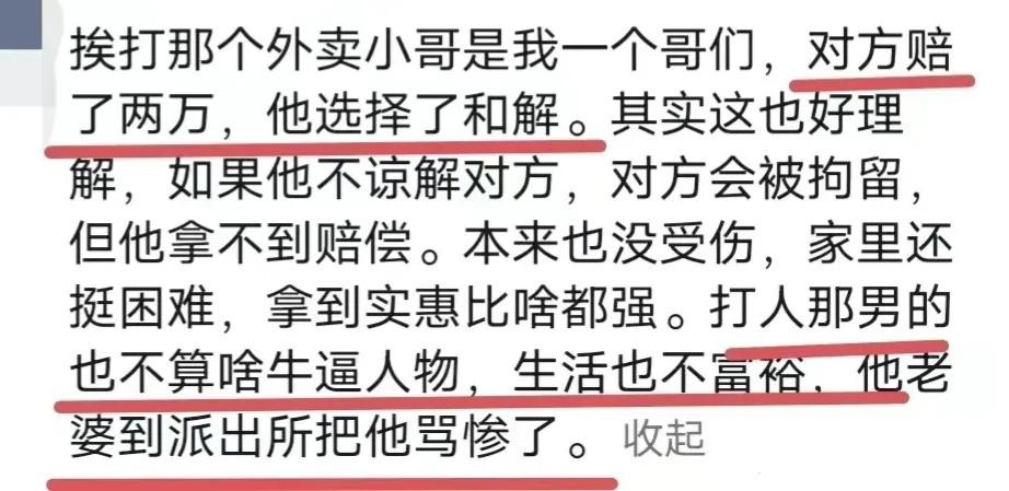 具体赔了多少钱呢?有自称外卖小哥朋友的网友透露:赔了2万,外卖小哥家里比较困难,拿到实惠比啥都强;打人者也不是什么牛人,生活也不富裕,他老婆跑到派出所把他骂惨了。