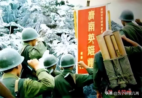 在老山作战的济南英雄连正在宣誓,一个士兵背上背着的应该是炮弹。