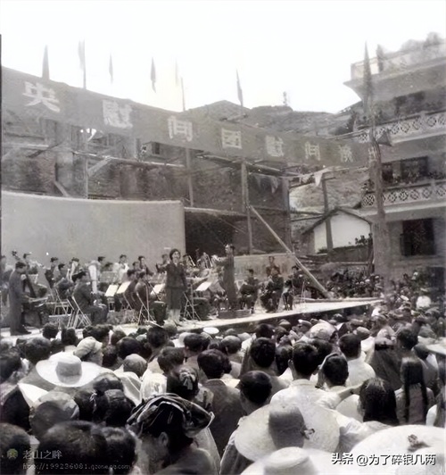 慰问团正在进行慰问演出,地点在麻粟坡县的一个露天电影院,其中还有不少当地群众在观看。