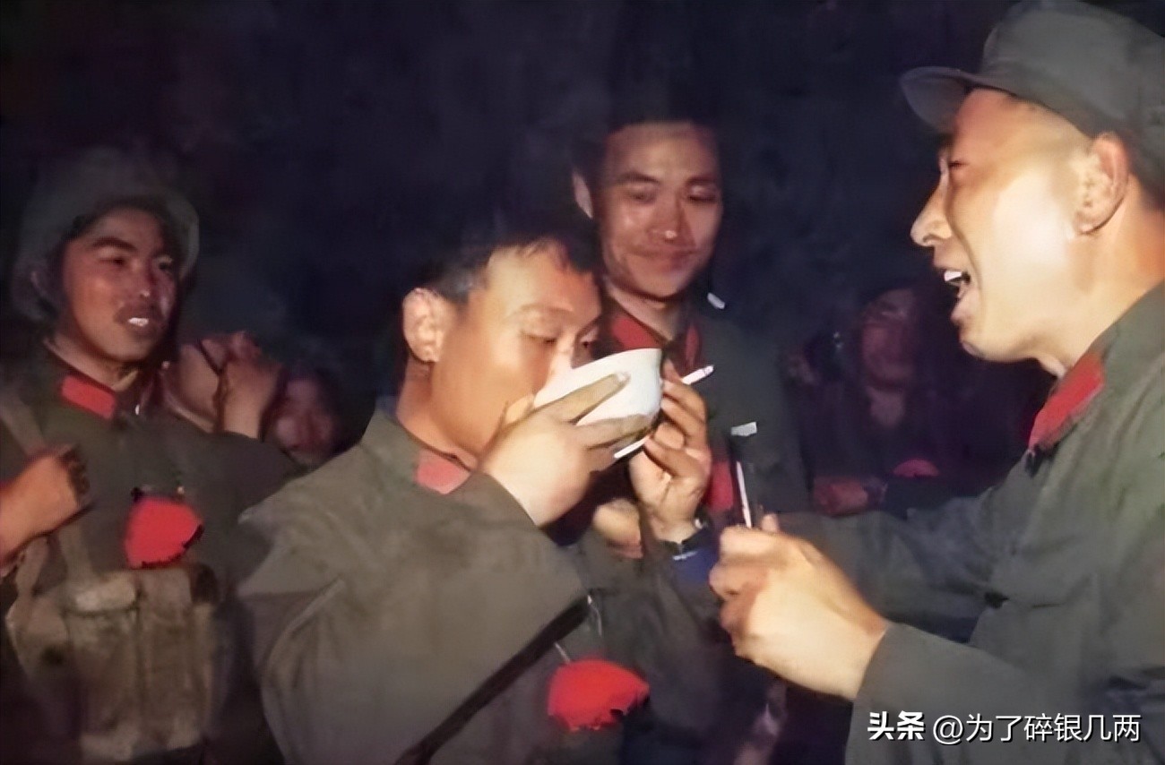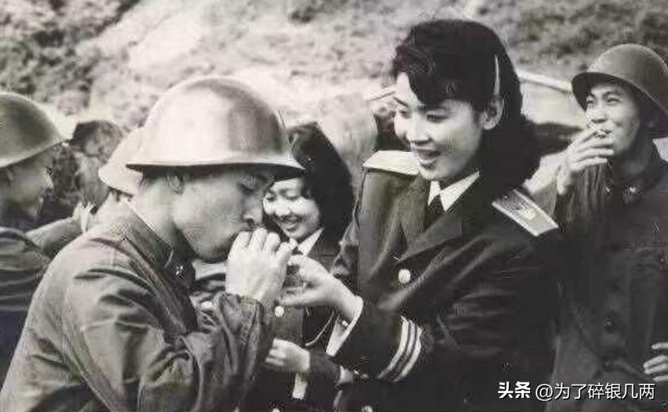 前线慰问团的文艺兵,给前线的战士们敬烟,从战士们的表情来看,应该是蛮高兴的。