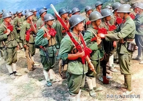 出征前正在给战士们披红,这些战士隶属于27军,对越反击战中涌现出不少英雄连队。