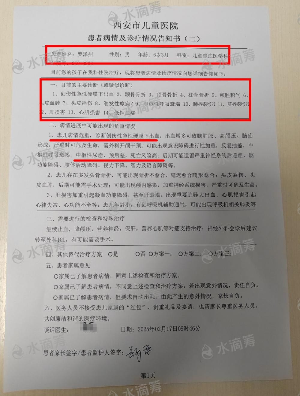 筹款平台上显示的病情及诊断告知书写明,罗泽州被诊断为创伤性急性硬膜下出血,颞骨、顶骨和枕骨骨折,中枢性呼吸衰竭,肝损害以及心肌损害等。