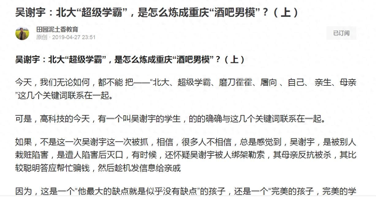 据报道,吴谢宇弑母后,还在培训机构做“家教”、还在酒吧当“男模”。