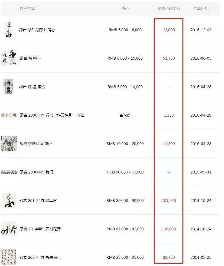 ▲邵岩依托雅昌艺术网建立的个人官网里展示的部分作品的拍卖记录