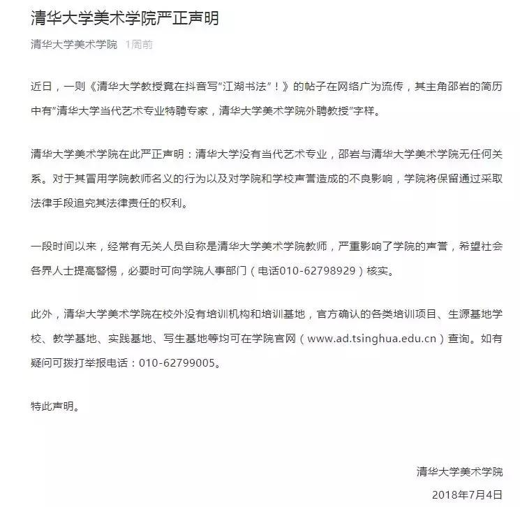 红星新闻记者根据该声明上公布的电话联系到清华大学美术学院,一位工作人员表示,“他如果有聘书的话,可以让他发来,我们不会随便说这些话。”