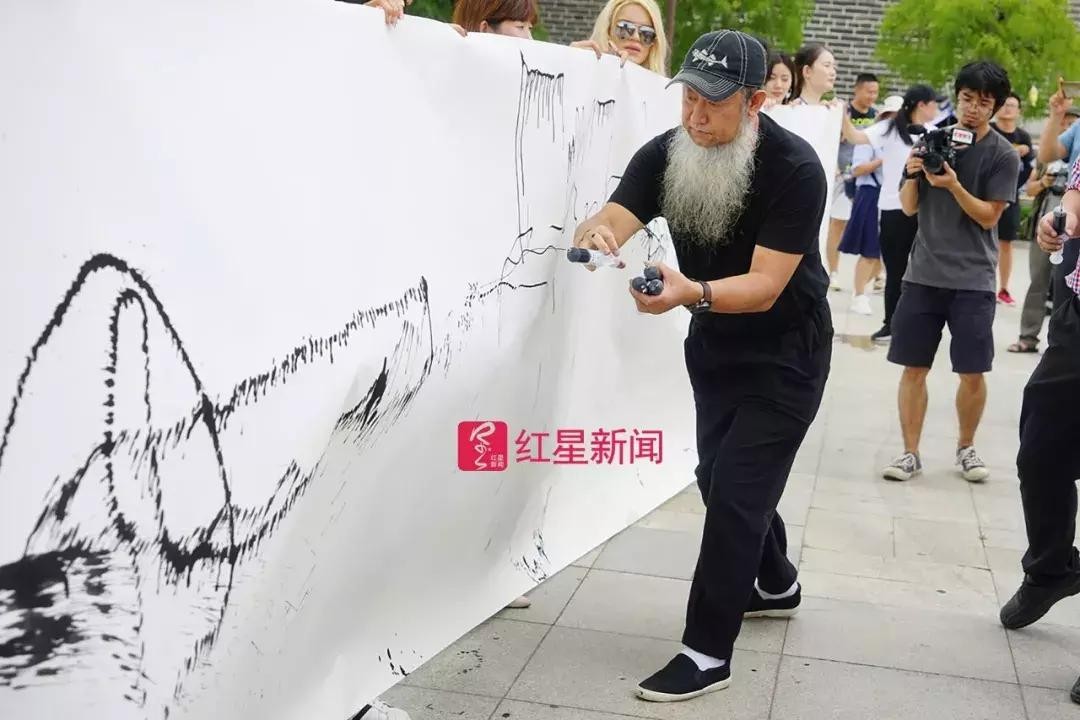 视频中,他黑衣白髯,手拿4个注射器进行“射墨”,身旁还不时传出叫好声。