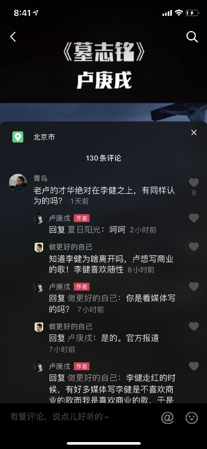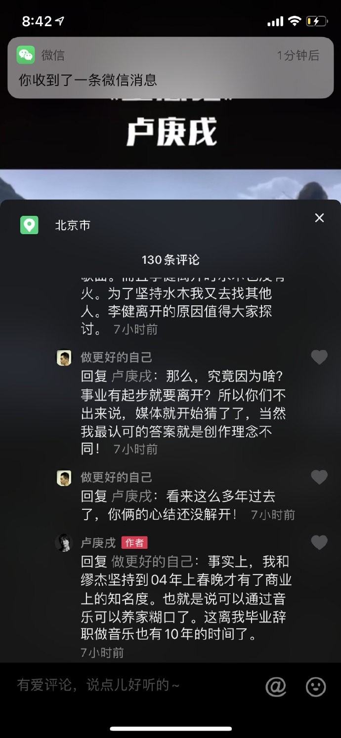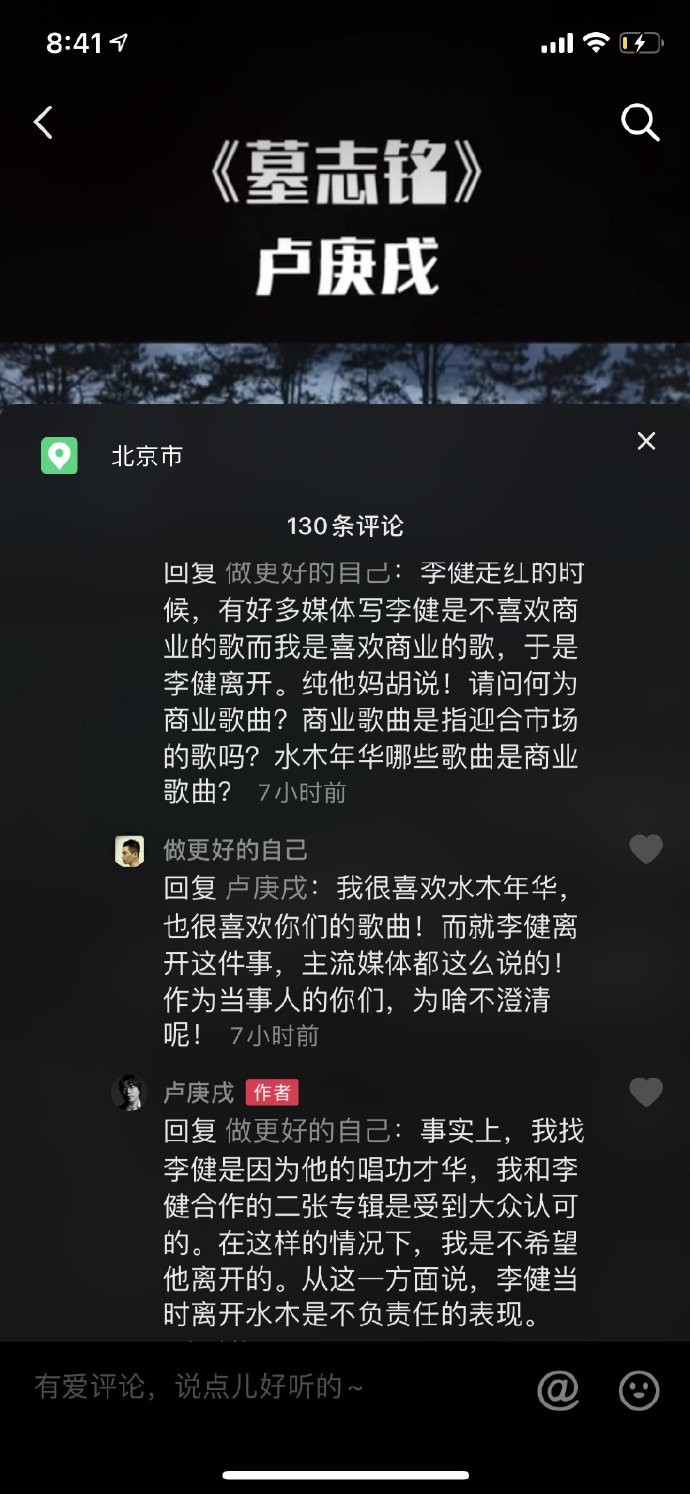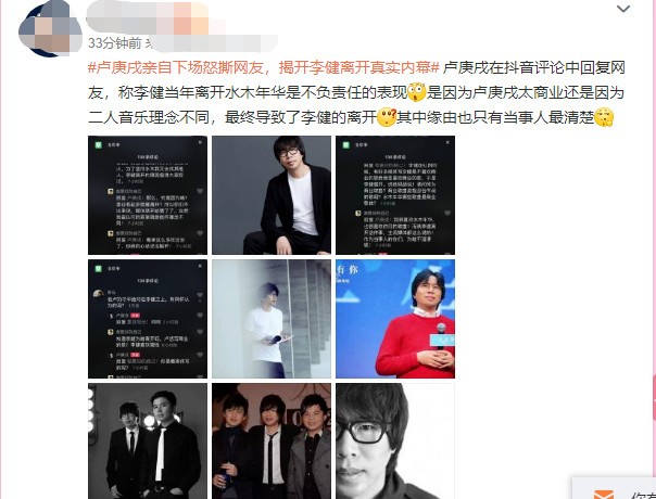 而水木年华的卢庚戌回复该网友称:事实上我和缪杰坚持到04年上春晚才有了商业上的知名度。也就是说可以通过音乐可以养家糊口了,这离我辞职做音乐也有10年的时间了,卢庚戌还回复网友说:李健走红的时候有好多媒体写李建是不喜欢商业歌而我喜欢商业歌,于是李建离开。