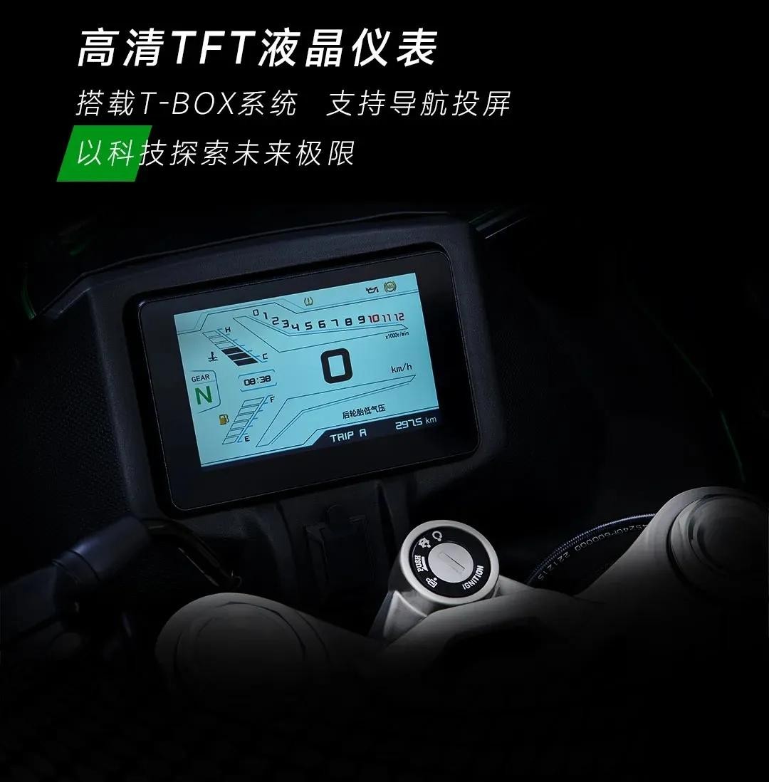 其次是本车的操控性,标配了TCS牵引力控制系统,滑动离合,前后ABS,785mm的坐高,另外智能化也是毫不吝啬,配备了胎压/胎温监测,背光手把按钮,前置行车记录仪,车机互联系统,投屏导航,全彩TFT仪表,USB充电口等多功能