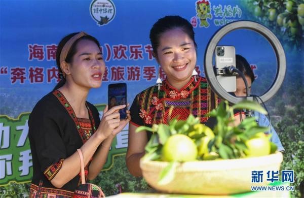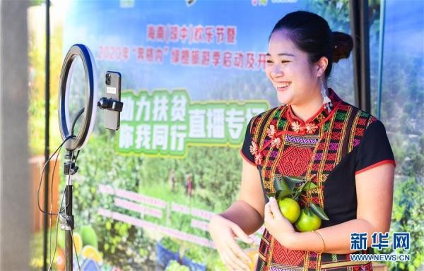 11月1日,主播在南斗山琼中绿橙示范种植基地举行的琼中绿橙开摘仪式上直播带货琼中绿橙。 近日,海南琼中黎族苗族自治县琼中绿橙迎来上市季。2020年,琼中绿橙种植面积达2.9万亩,挂果面积1万亩,预计产量将达到1000万斤。 新华社记者 杨冠宇 摄