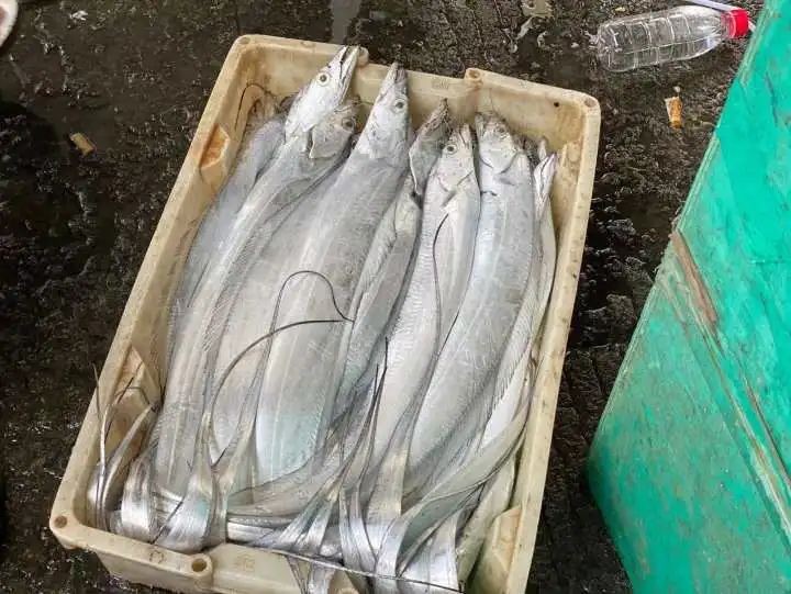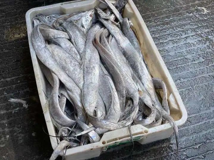 我们先来看看货,这种物美价廉的本地带鱼,从体表上看,银色的部分有很多刮蹭伤,颜值比钓带要低许多,这种货行话叫“网带”。