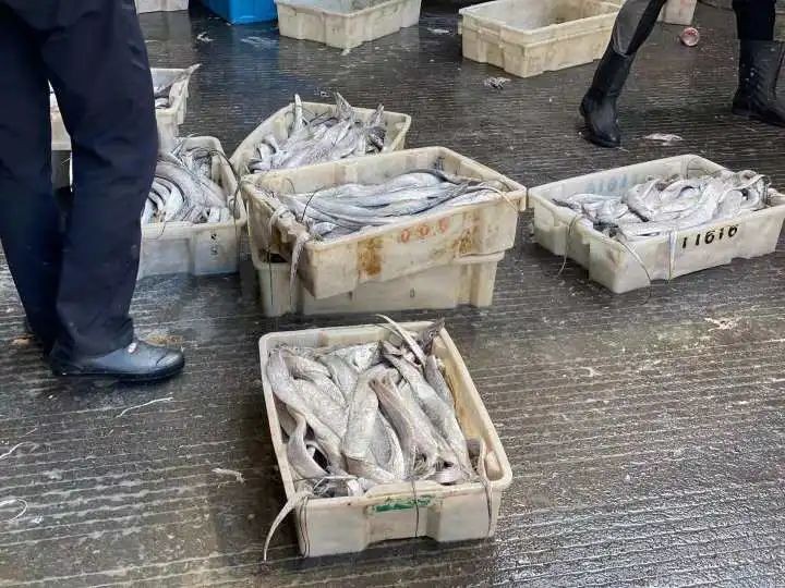 在整个市场里,钓带是带鱼中的尖货,价位也是最高的,一条八两的批发价35元/斤,这两天已经便宜到30元/斤。