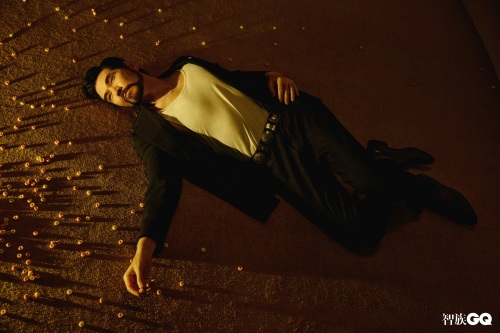躺在地上,黑色西装,内搭白色背心,野性十足。