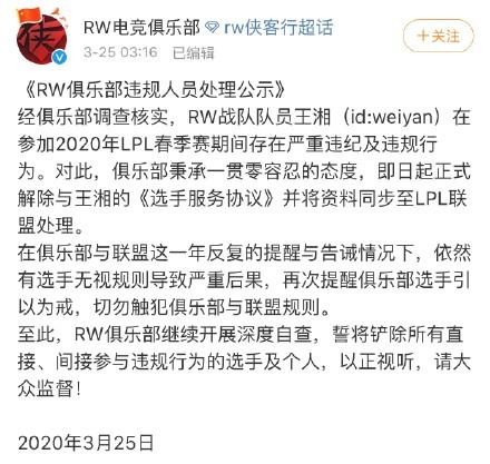 在3月25日凌晨3点左右,RW官方微博发布有关解除选手魏延的公告,表示经核查RW战队队员王湘(id:weiyan)在参加2020年LPL春季赛期间存在严重违纪及违规行为。对此,俱乐部秉承一贯零容忍的态度,即日起正式解除与王湘的《选手服务协议》并将资料同步至LPL联盟处理。