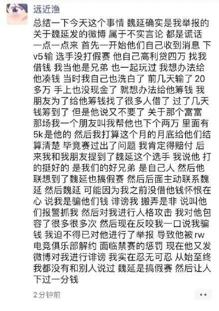在该项公告发布之后,魏延选手也在微博上自曝了自己假赛的经过。坚持认为自己受到了假赛的诱惑,但是最后在比赛的过程中并没有参与假赛,并早已将菠菜人员删除了微信。具体情况为“春节期间在老家无所事事,跟朋友打牌输了很多钱输昏了头,于是便找这个人借钱,2月28号,这个人找上我计划让我在LPL开始后打假赛并支付我定金,当时我脑子一热便答应了。”“这个事情是我一个人的事情,因为我自己口嗨和打牌,俱乐部开除我我认了,但我发誓我没有打过假赛!”