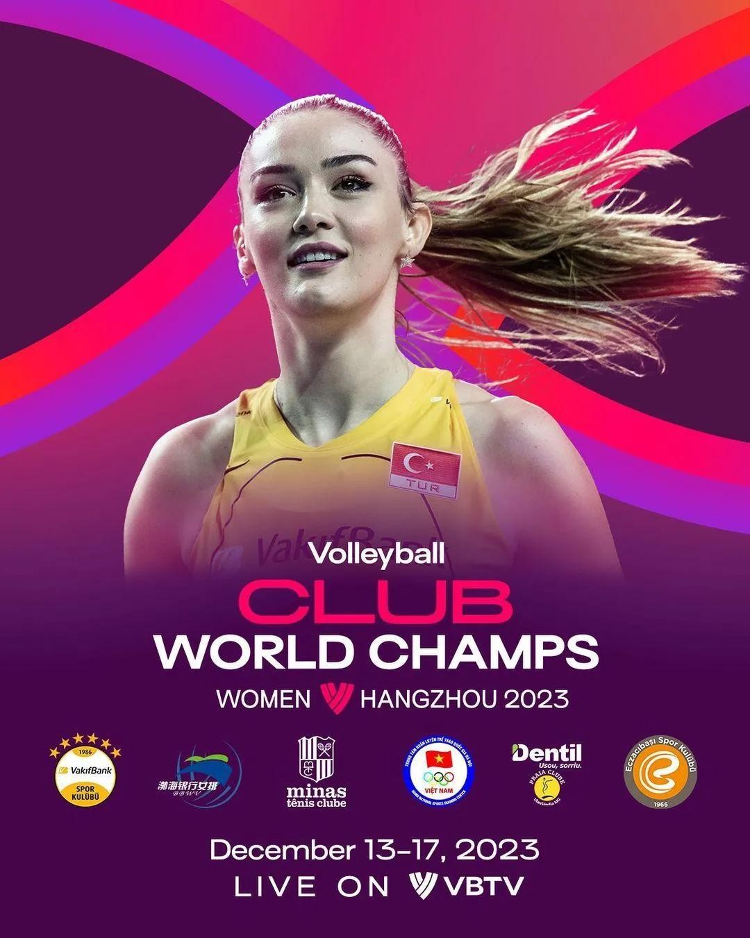 2023女排世俱杯将于2023年12月13-17日在杭州举行,参赛的六支队伍分别是土超两豪门瓦基弗银行和伊萨奇巴希、巴超两劲旅米纳斯和乌兰贝迪亚海滩、亚俱杯冠军越南体育中心和代表东道主出战的中国天津渤海银行。