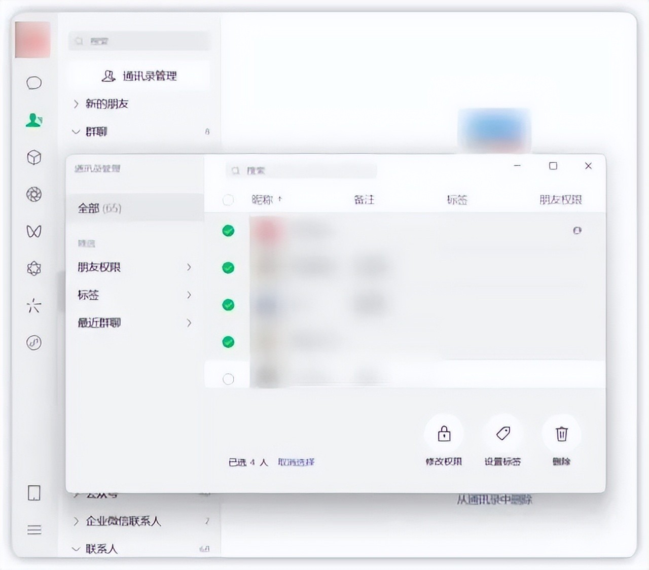 2024年12月,微信PC版更新功能,进一步完善了好友管理功能。点击左侧【通讯录】按钮,进入通讯录页面后,再点击顶部的「【通讯录管理】,在弹出的窗口中,可集中编辑好友备注名、标签、好友权限,更可批量删除好友。
