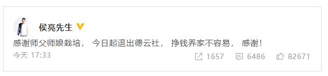 8月1日,相声演员侯鹤廉发文宣布退出德云社:“感谢师父师娘栽培,今日起退出德云社,挣钱养家不容易,感谢!”