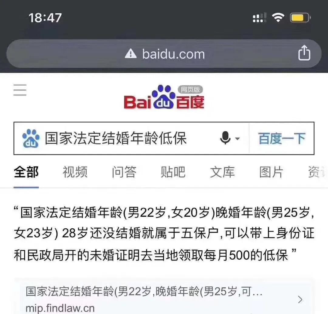 最近朋友圈被刷屏了,听说男的国家法定结婚年龄是22岁,女的国家法定结婚年龄是20岁,网传男女28岁还没结婚就属于五保户,可以带上身份证和民政局开的未婚证明,去当地领取每月500的低保。
