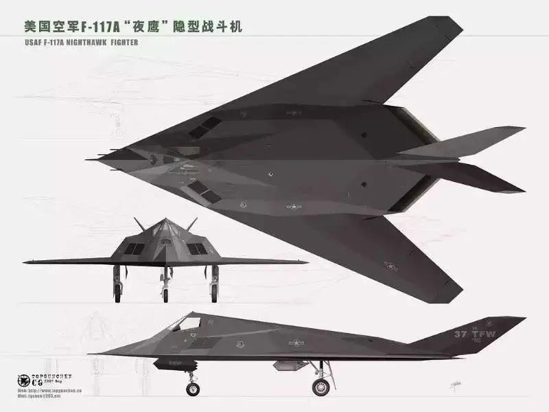 F-117夜鹰全机长20.08米,机高3.78米,翼展13.2米,最大起飞重量23400千克,最大飞行速度1040千米每小时,作战半径可达1056千米,仅需一人操作