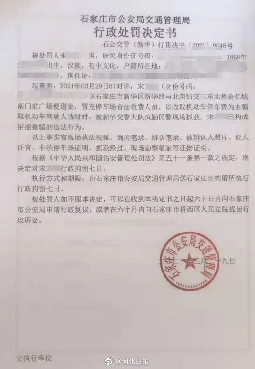 石家庄2男子冒充收费员违法收取停车费被拘留