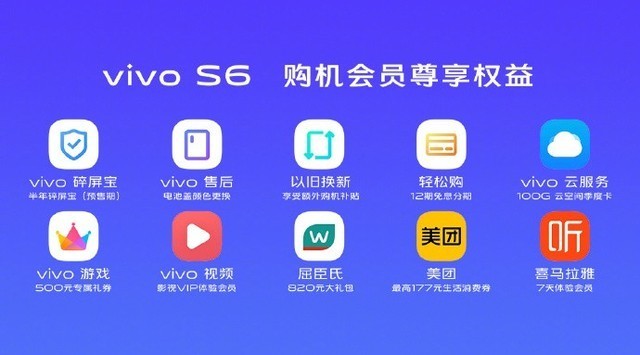 vivo S6购机权益含半年碎屏保、6折购买碎屏保、“电池盖换色” 及价值1400元线上权益大礼包。同时,参加S6以旧换新活动,可享受额外购机补贴,最高可享12期免息分期。