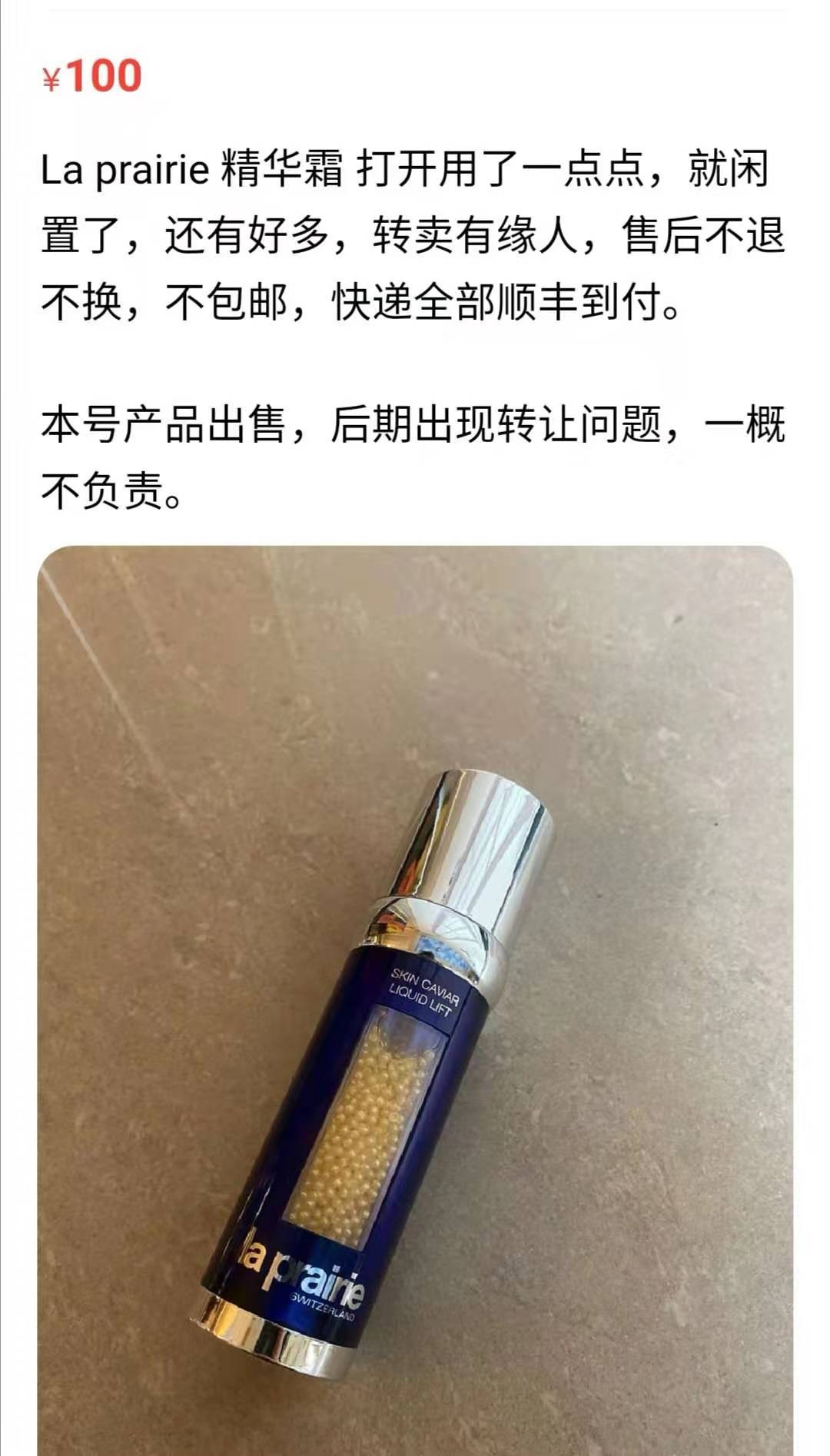 贵妇级护肤品La Prairie精华霜原价4600元,郑爽售卖100元,虽说是二手的,从图中看也只是用了一点点,100元的售价可以说是不要钱了。