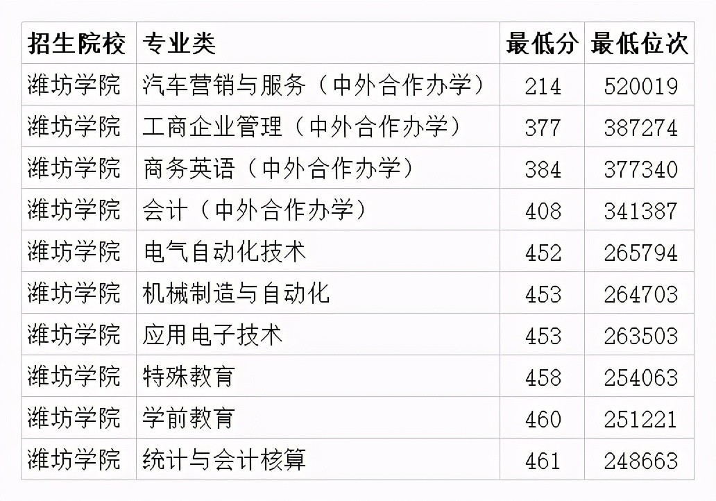 潍坊学院设置的专科专业不是太多,十个专业中还有四个是校企合作方向,而且非校企合作方向的专业分数线都比较高,均超过了普通类一段线。
