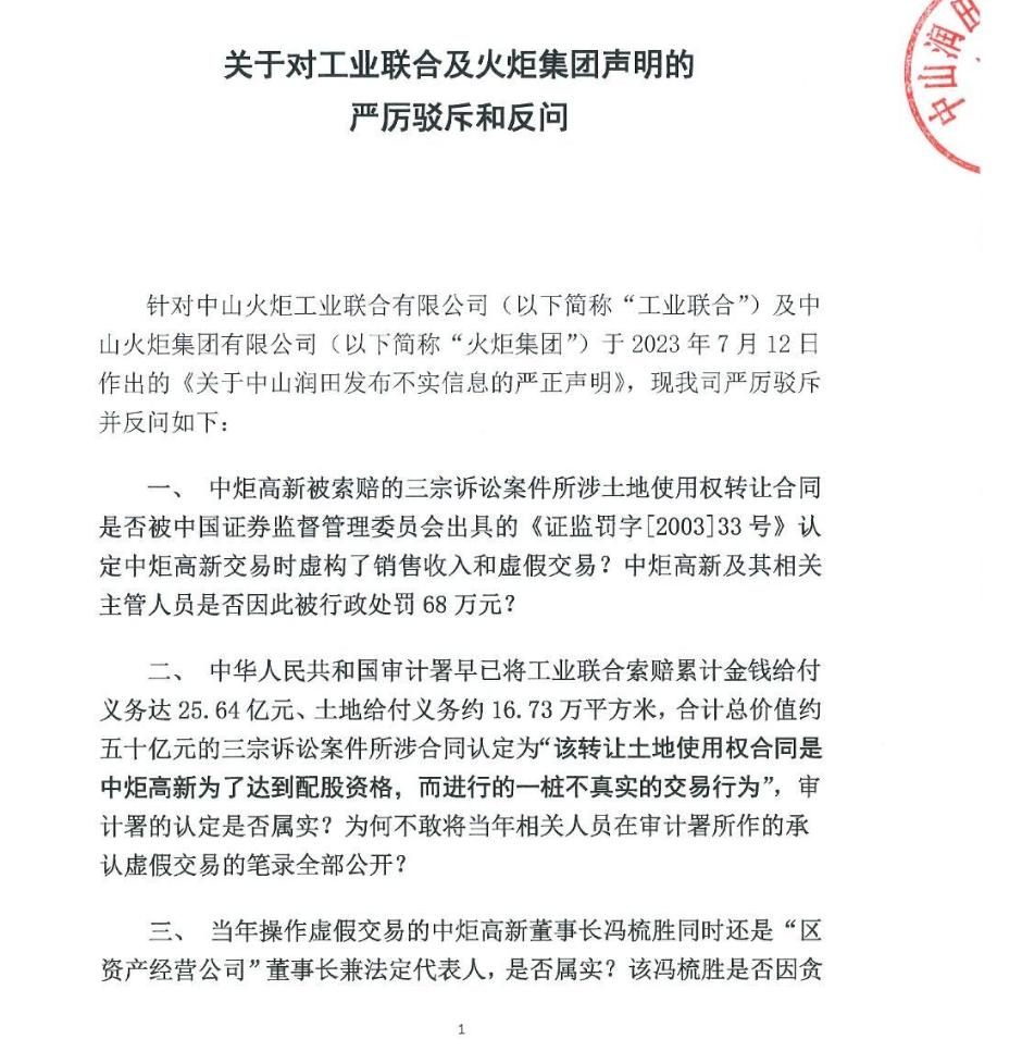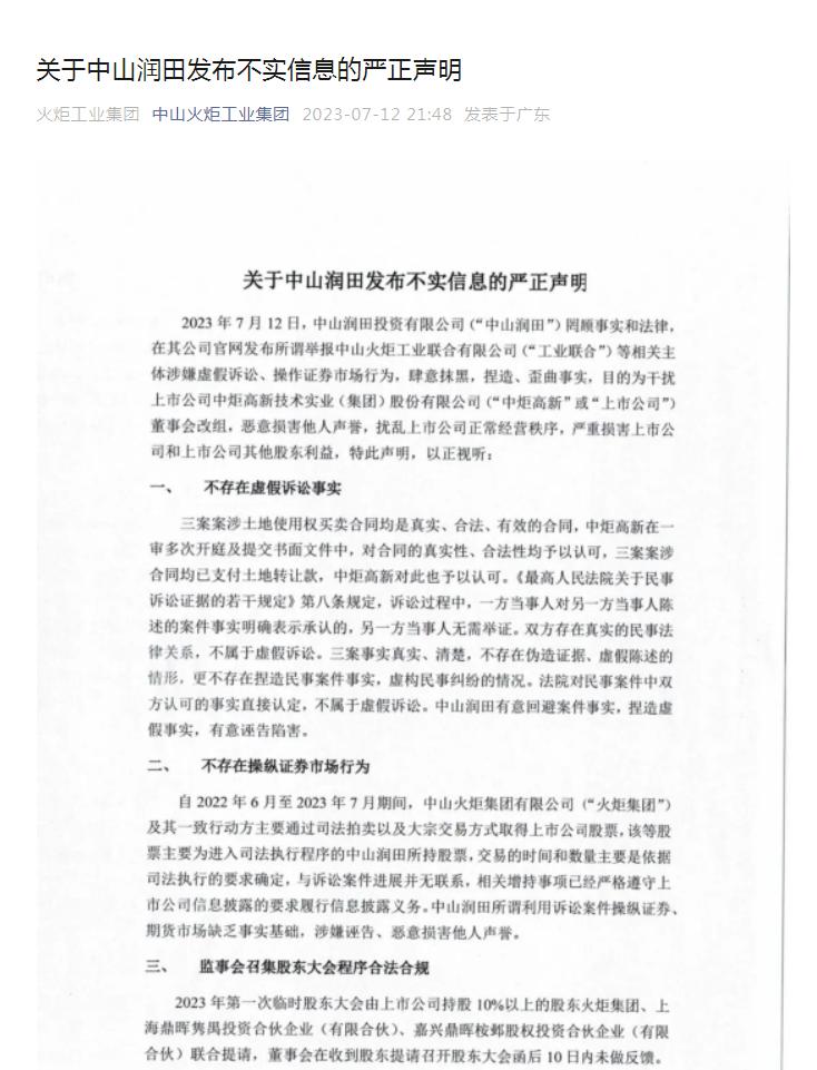 7 月 12 日晚,中山火炬集团有限公司发布了《关于中山润田发布不实信息的严正声明》,《声明》称,中山润田此次发表声明举报,目的包括恶意损害他人声誉,扰乱上市公司正常经营秩序,严重损害了上市公司和上市公司其他股东利益。