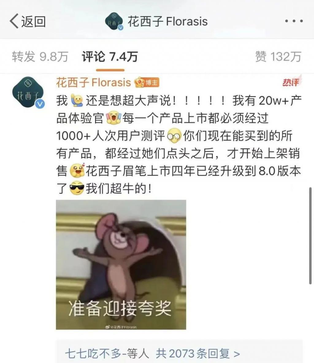在提及网友关于眉笔价格的疑问时,花西子回应称," 真的有人会拿克重去衡量眉笔的价值吗?大家小时候去文具店买铅笔时,在 2B 铅笔和自动铅笔之间,你最终是因为笔芯克重才买的自动铅笔吗?"
