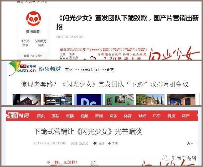还有网友评论,“当年百鸟朝凤的导演下跪,就尴尬了好久,第一个吃螃蟹的人是英雄,第二个吃螃蟹的人就不好玩了。”“人的尊严都是无价的。如果靠下跪求来了票房的话,那将是业界的羞耻,亦是笑话——观众不会因为怜悯施舍给你票房。只有站着把钱挣了,才能赢得他人的尊重和自我的认同……”《闪光少女》的海报设计师当晚就发朋友圈称,“我没跪,也不需要你为我跪。”