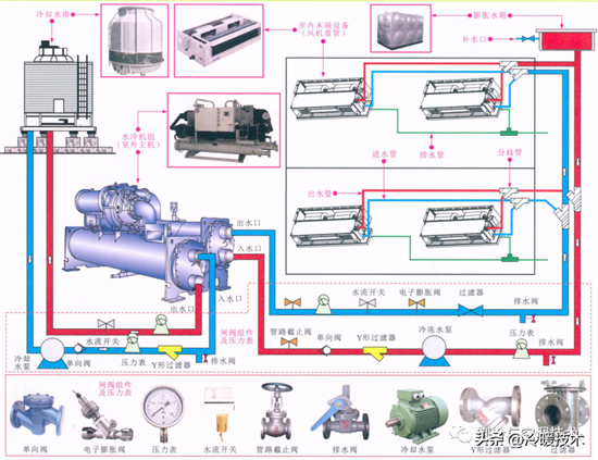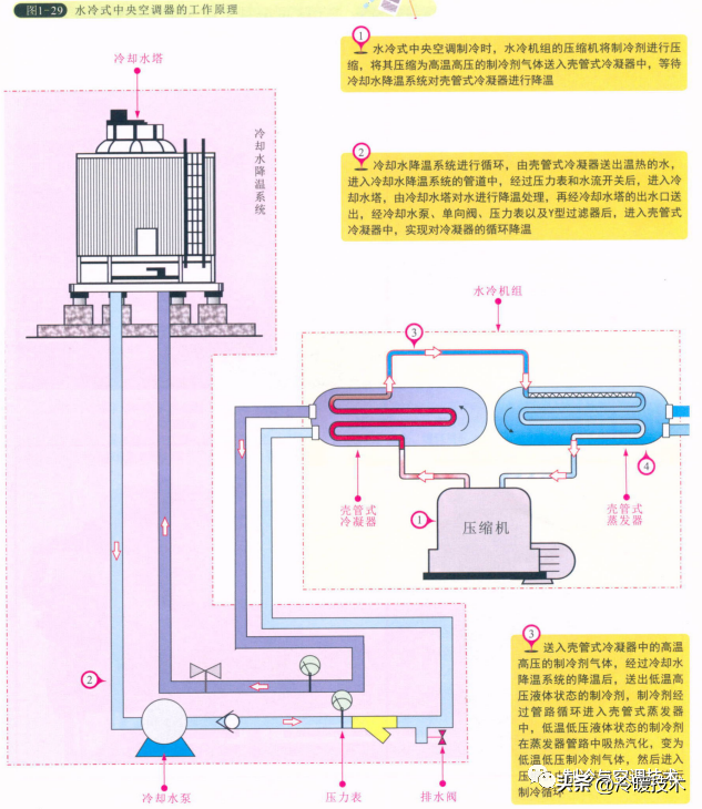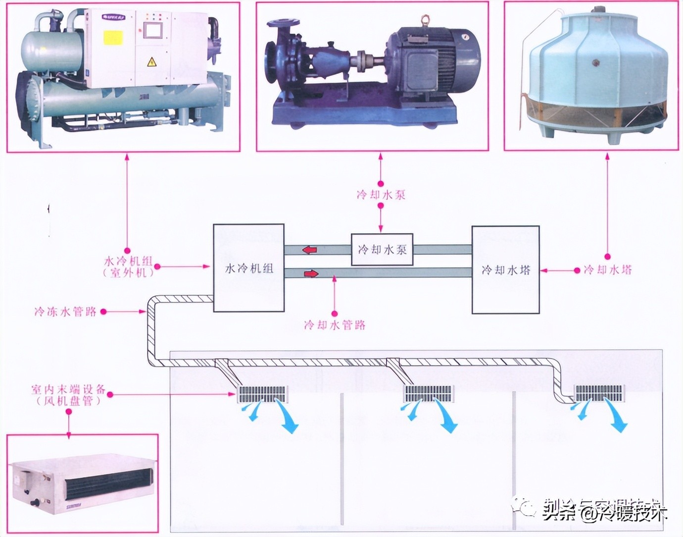 水冷式中央空调是通过冷却水塔、冷却水泵对冷却水进行降温循环从而对水冷机组中冷凝器内的制冷剂进行降温,使降温后的制冷剂流向蒸发器中,经蒸发器对循环的冷冻水进行降温,从而将降温后的冷冻水送至室内末端设备(风机盘管)中,由室内末端设备(风机盘管)与室内空气进行热交换后,从而实现对空气的调节。