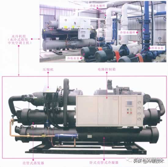 水冷式中央空调的蒸发器、冷凝器及压缩机均安装在水冷机组,其中,冷凝器采用冷却水循环冷却的方式。