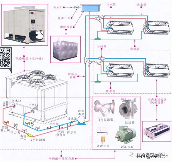 风冷式水循环商用中央空调系统主要是由风冷机组、室内末端设备(风机盘管)、膨胀水箱、制冷管路、冷冻水泵以及闸阀组件和压力表等构成。