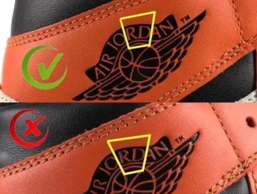 把真假AJ放在一起对比(灰真红假),你会发现这个假AJ的logo工艺其实也挺好。假AJ的图案完全是对的,只不过真AJ的logo浮雕比较深,假货都做到这个份儿上了,的确是真假难辨;