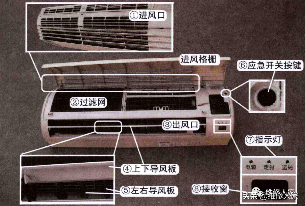 ① 进风口:房间的空气由进风格栅吸入,并通过过滤网除尘。