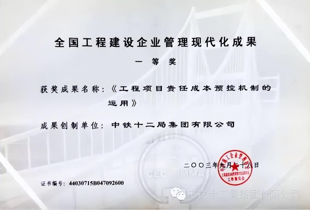 责任成本管理成果获全国工程建设企业现代化成果一等奖