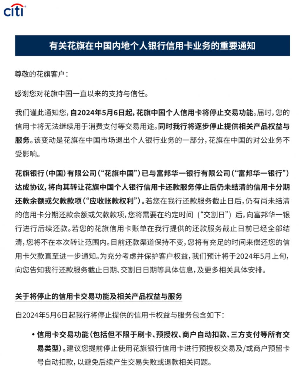 1 月 23 日,花旗银行 ( 中国 ) 有限公司发布《有关花旗在中国内地个人银行信用卡业务的重要通知》显示,自 2024 年 5 月 6 日起,花旗中国个人信用卡将停止交易功能,届时将无法继续用于消费支付等交易用途。同时该行将逐步停止提供相关产品权益与服务。